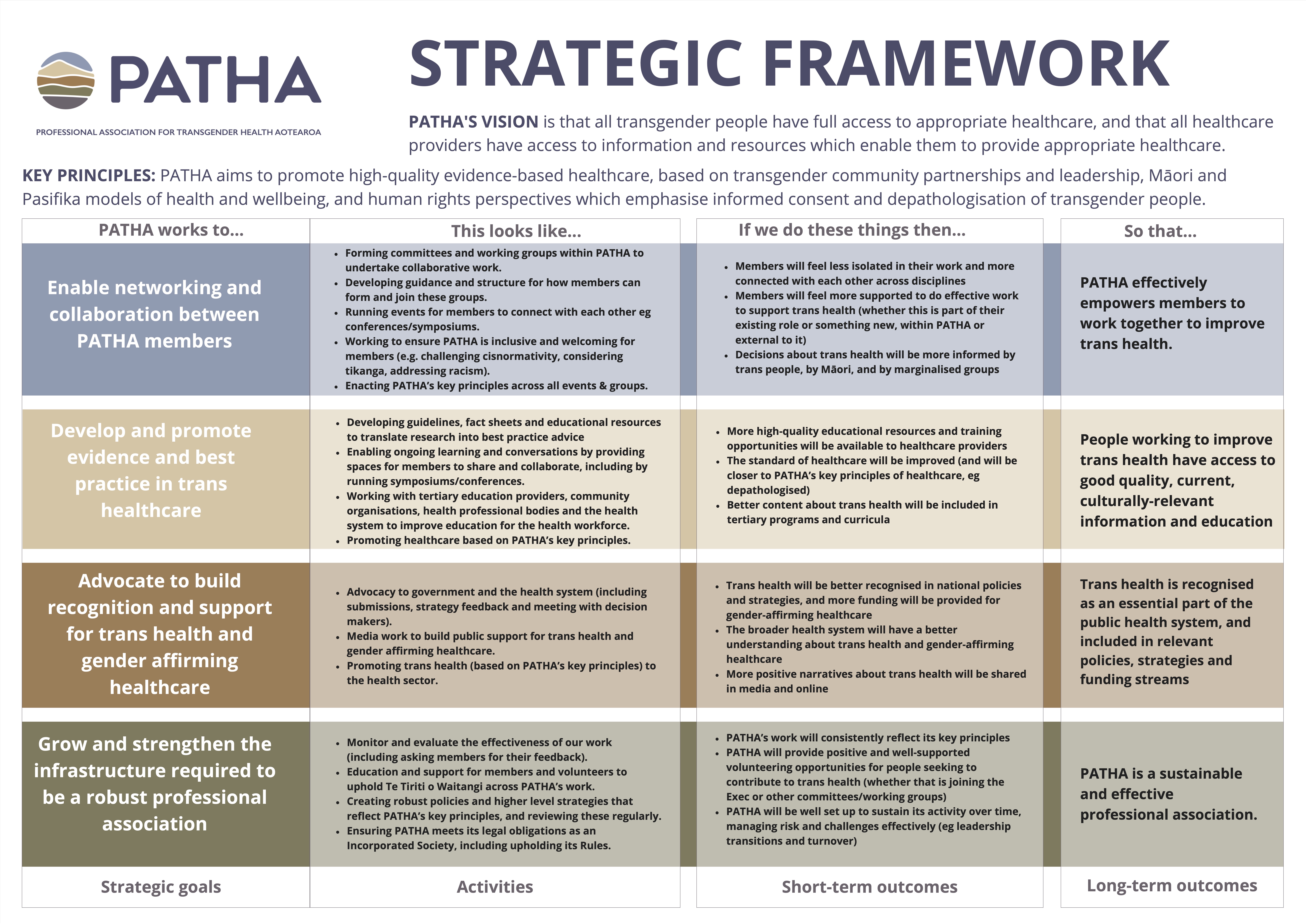 KEY PRINCIPLES: PATHA aims to promote high- quality evidence- based healthcare, based on transgender community partnerships and leadership, Māori and Pasifika models of health and wellbeing, and human rights perspectives which emphasise informed consent and depathologisation of transgender people.